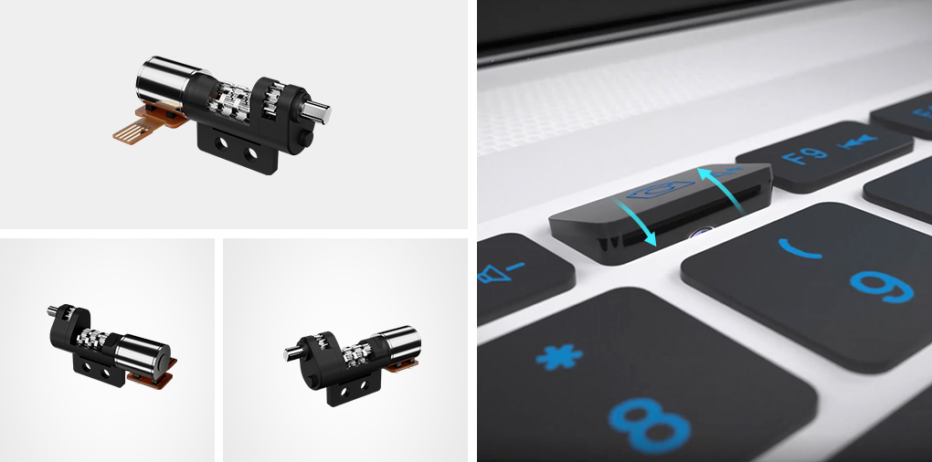 據了解,隨著筆記本逐步的輕薄化,也有廠商開始追求極致的輕薄,追求極窄邊框,因此需要縮小屏幕周圍邊框,然而這正是大多數電腦攝像頭的安裝位置。為此,兆威別出心裁,開發出一款帶翻轉功能的隱藏式攝像頭驅動系統,利用緊湊的微型驅動結構,可以在有限的空間內,輸出較大力矩,使得攝像頭平時處于隱藏狀態,當需要時候,只需要按下鍵盤即可一鍵彈出。